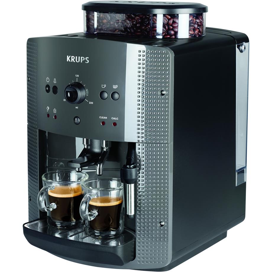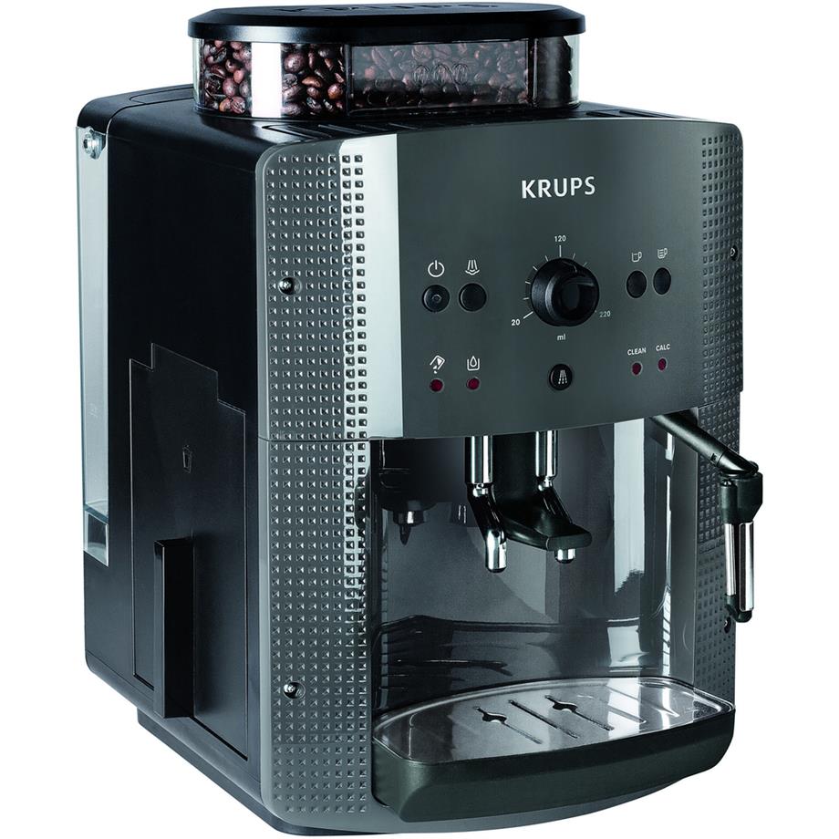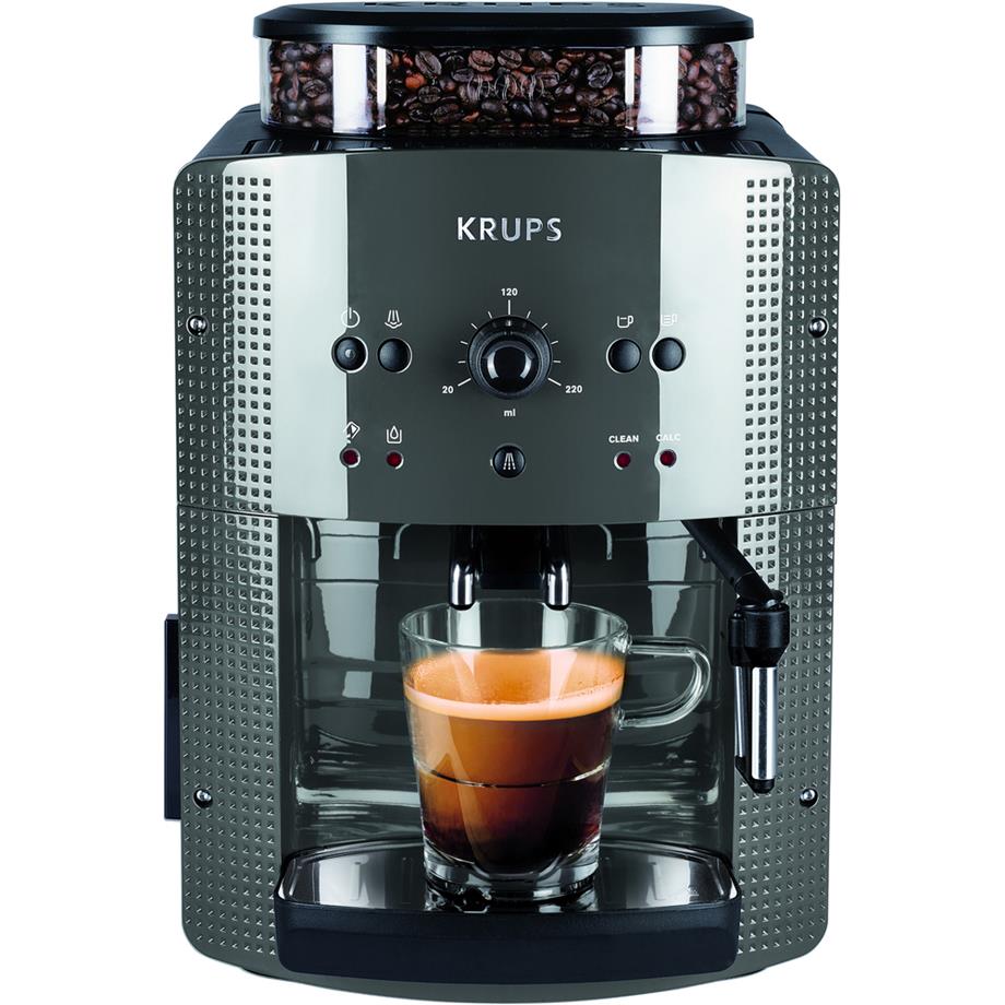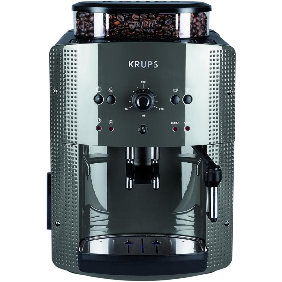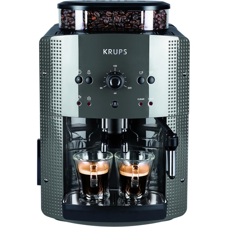 Plně automatický kompaktní kávovar v šedé barvě s parní tryskou pro přípravu cappuccina. Krups EA810B70 Essential Espresso disponuje ovládacím panelem s LED kontrolkami pro jednoduché ovládání, kovovým kónickým mlýnkem se 3 stupni nastavení hrubosti mletí a 1,7 litrovou vyjímatelnou nádobou na vodu.