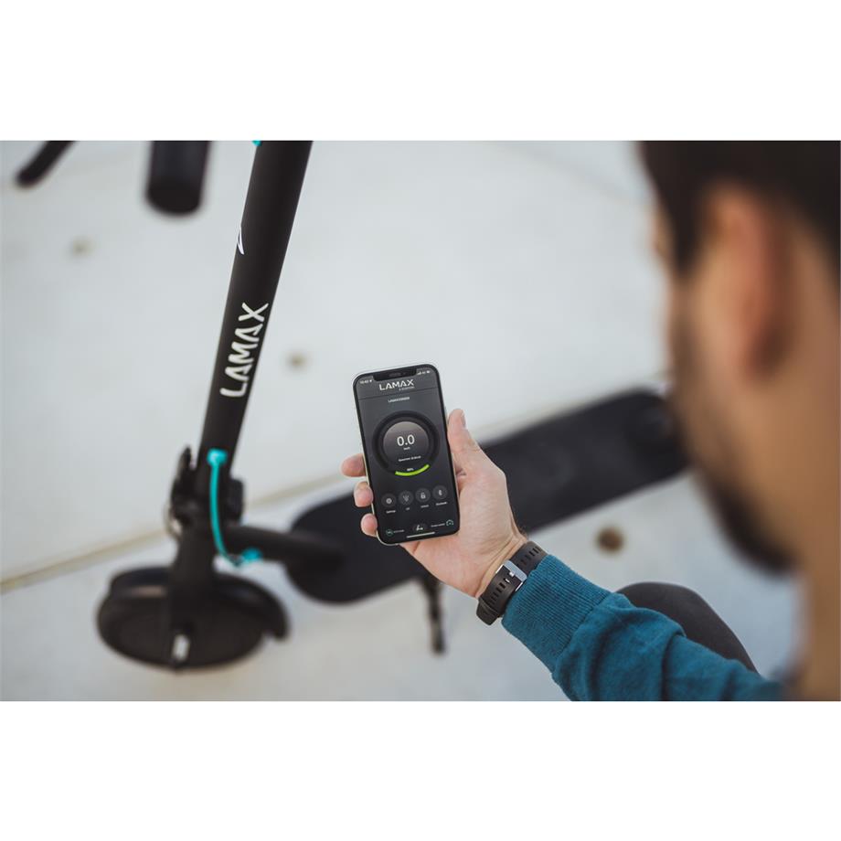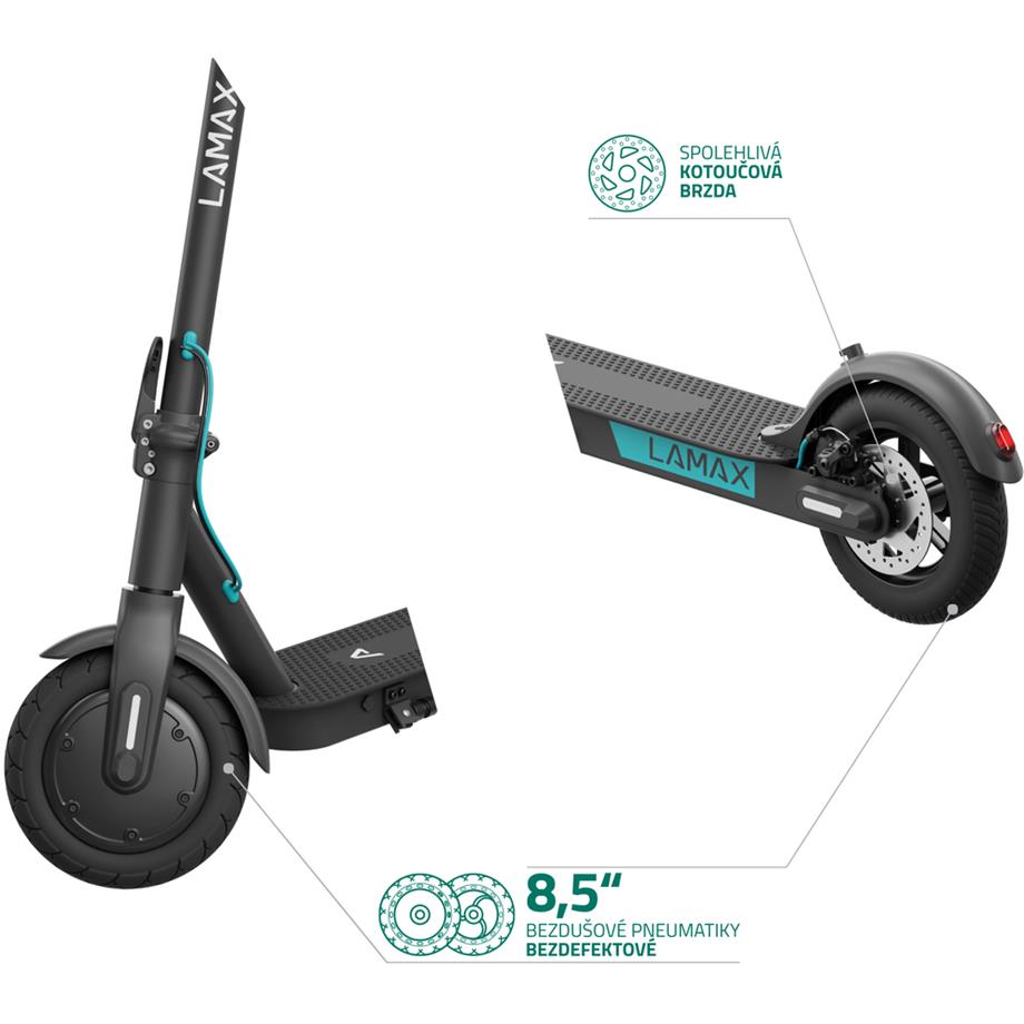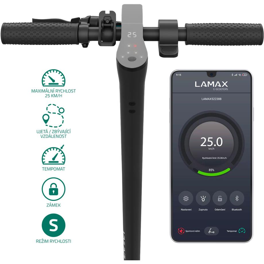 Výkonná skládací elektrická koloběžka Lamax S7500 Plus má kvalitní 8.5" bezdušové pneumatiky, jezdí rychlostí až 25 km/h, na jedno nabití ujede až 25 km a unese jezdce s vahou až 100 kg. Přehledný LCD displej, výkonná 7 500 mAh baterie s rekuperací, 350W motor s maximálním výkonem až 600W. Bezpečnostní přední i zadní LED osvětlení, antireflexní prvky, zvonek i sklápěcí stojánek. Doprovodná aplikace pro Android i iOS, nízká váha 13 kg.