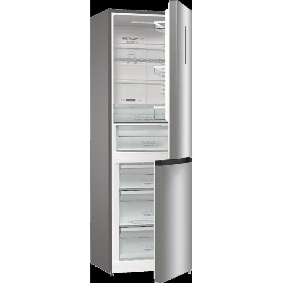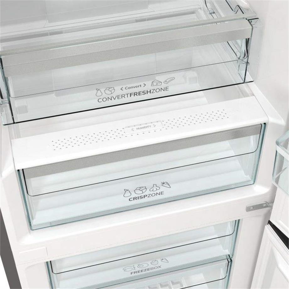 Kombinovaná chladnička Gorenje NRK6192AXL4 v nerezové barvě. Objem chladící části je 203 l. Vnitřní výbavu tvoří 4 skleněné police, kovový držák na láhve, dveřní police, stropní LED osvětlení a zásuvky: FreshZone a CrispZone s HumidityControl.