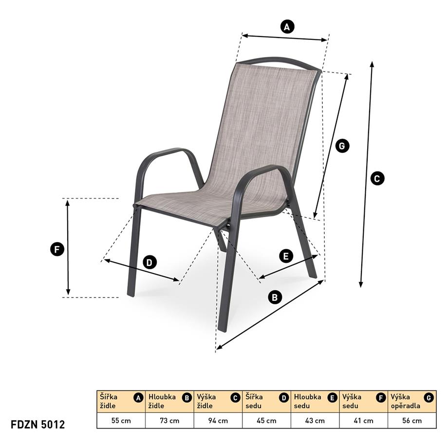 Zahradní židle FDZN 5112 nabídne veškeré pohodlí jak při obědě, tak při grilování nebo jen odpolední kávě. Židle s rozměry 55 x 73 x v. 94 cm má područky pro příjemnější posezení, vyšší opěradlo a měkkou výplň z odolné umělé textilie v béžové barvě. Síla nosných kovových profilů zaručuje židli vysokou nosnost, až 120 kg, a stabilitu, ale zároveň nízkou hmotnost, díky níž se s ní i lehce manipuluje. Použité materiály nevyžadují žádnou zvláštní údržbu, pro případnou očistu stačí voda s běžným (neabrazivním) čisticím prostředkem.