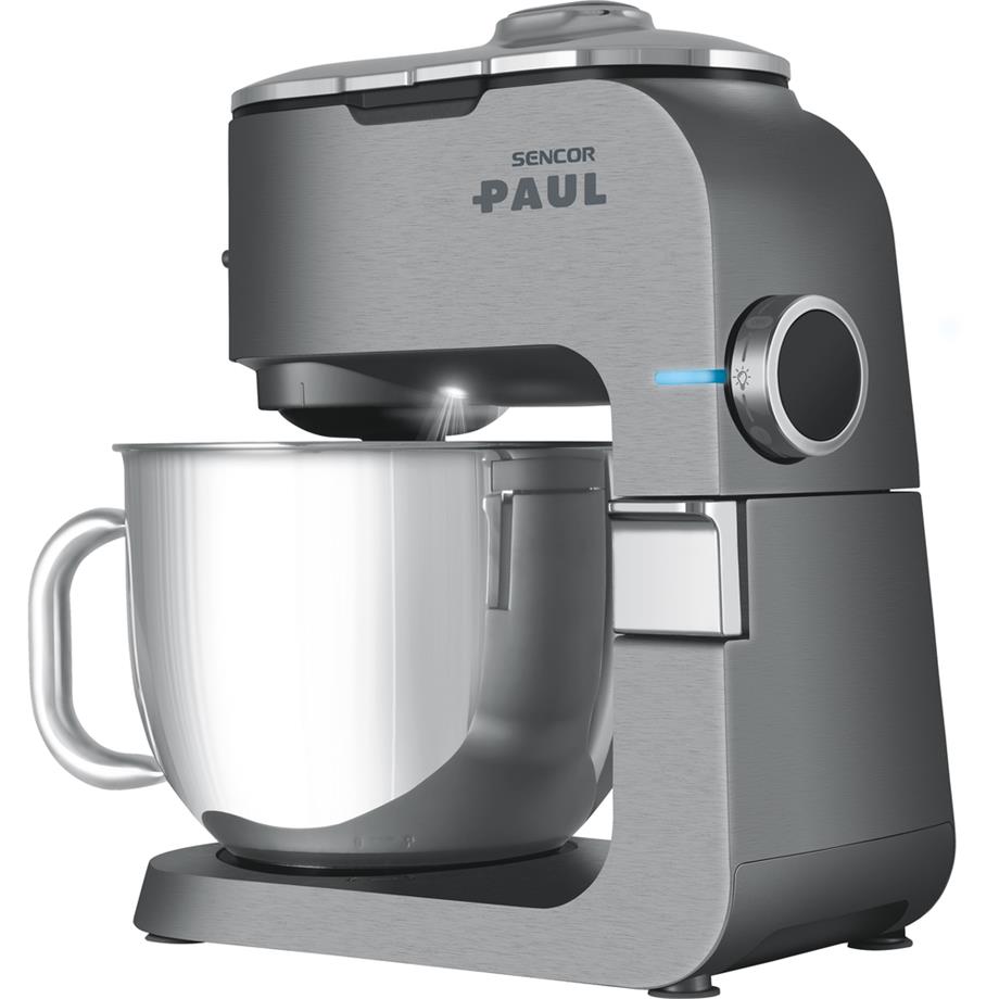 Kuchyňský robot, robustní celokovové tělo, Sencor Smart Power Energy, funkce Pulse, 6 a 3,5 l nerezové nádoby, 1,5 l skleněný mixér, masomlýnek, mlýnek na kávu, 3 nástavce, hnětací metla, LED osvětlení, výkon 1 500W, 6
