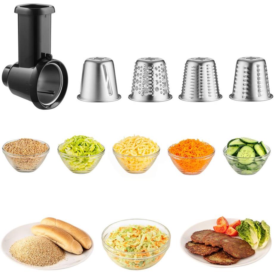 Robot je vybaven 4 nerezovými kuželovými struhadly. Během chvíle tak nakrájí a nastrouhá jakékoliv suroviny od ovoce a zeleniny přes sýry až po výrobu strouhanky. Na výběr máte jemné a hrubé struhadlo. Můžete s ním také krájet ingredience na tenké plátky, které jsou výborné například pro přípravu gratinovaných brambor.
