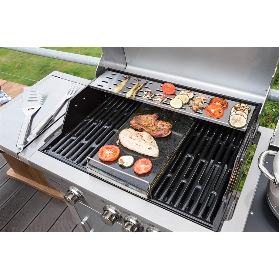 ke grilování. Pod pravou odkládací plochou se nachází boční hořák. Gril