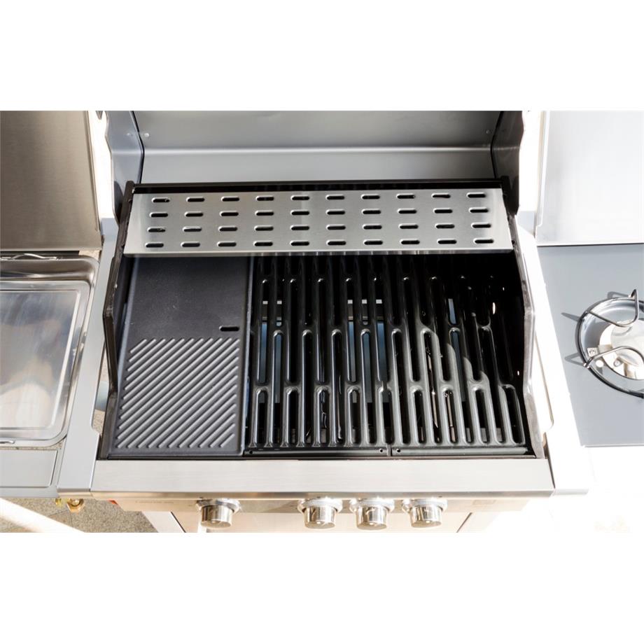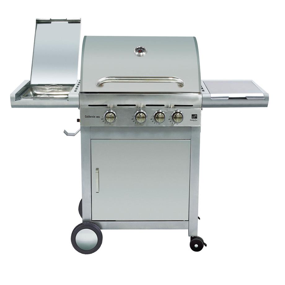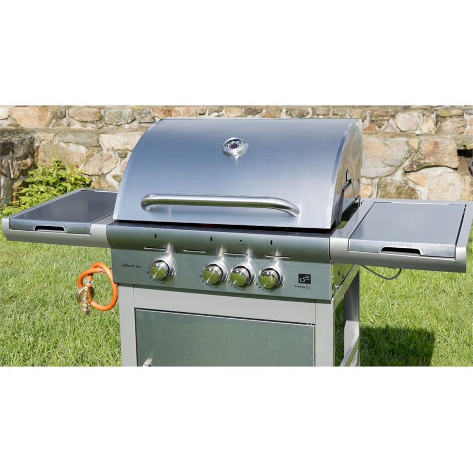 Nerezový plynový gril G21 California BBQ Premium Line s litinovým roštem, litinovým plátem, elektrickým zapalováním, plynovou regulací, s bočním hořákem o výkonu 3,15 kW a 3 hlavními hořáky, každý o maximálním výkonu 3,5 kW, systém Flame Tamer.
