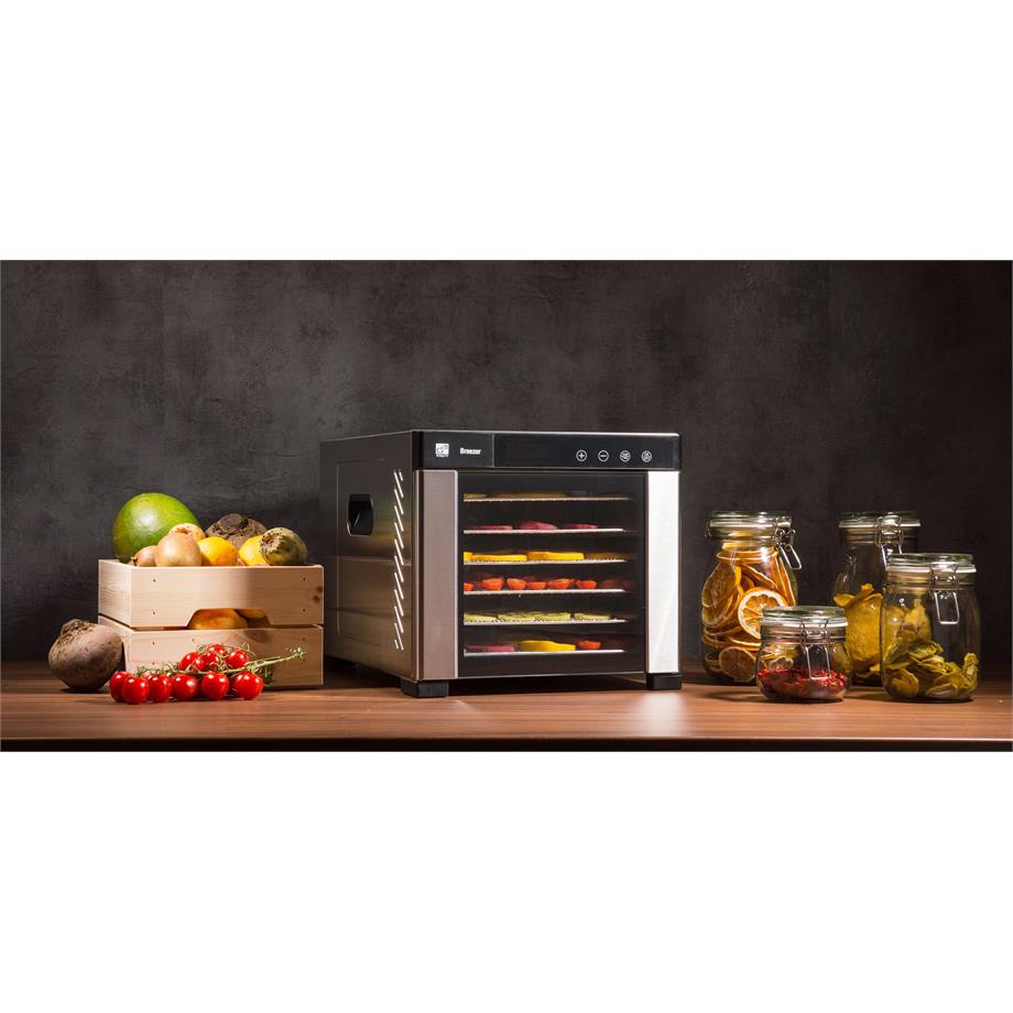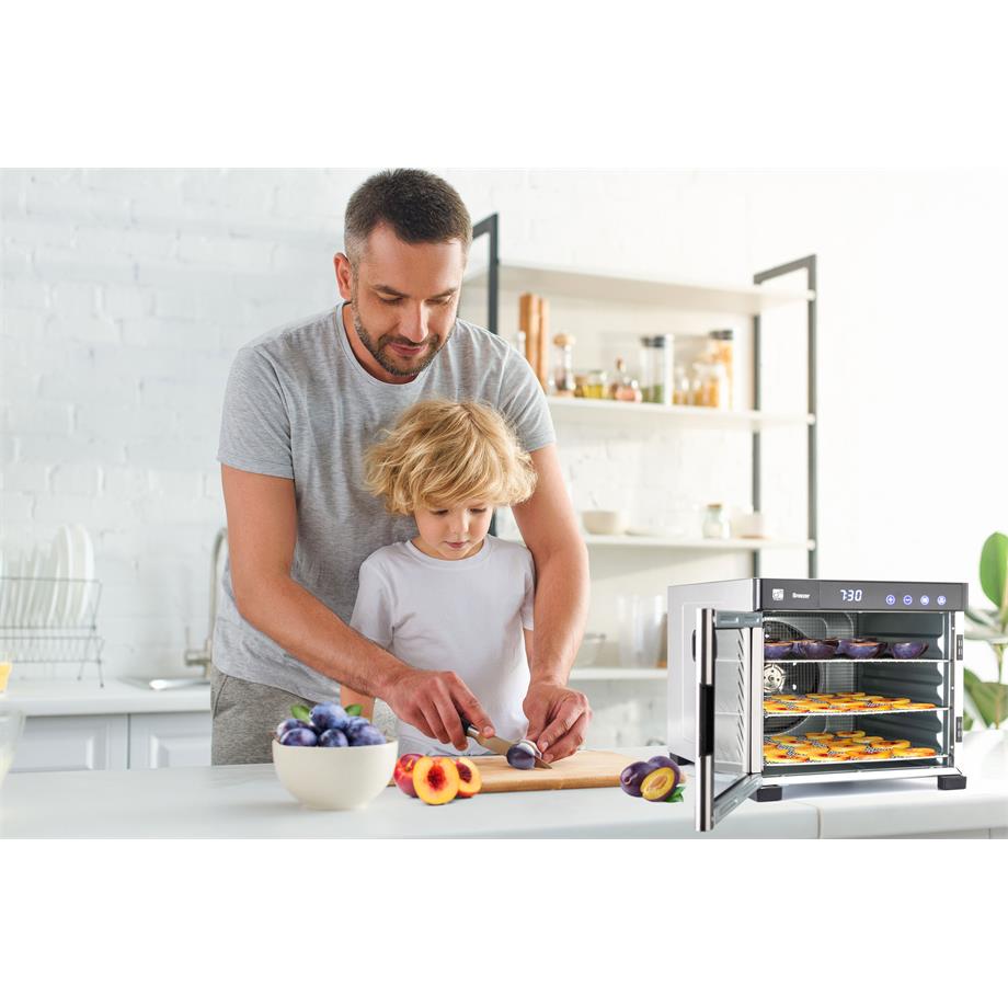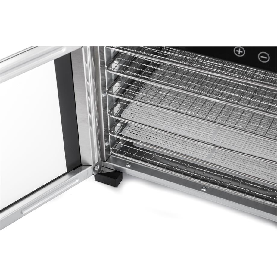 Horizontální nerezová sušička potravin s dvířky, časovačem, 6 sušícími platy a 6 jemnými síty suší ovoce, zeleninu i další suroviny naprosto rovnoměrně. Čím vás ještě nadchne?