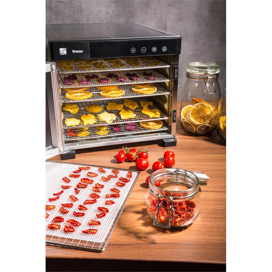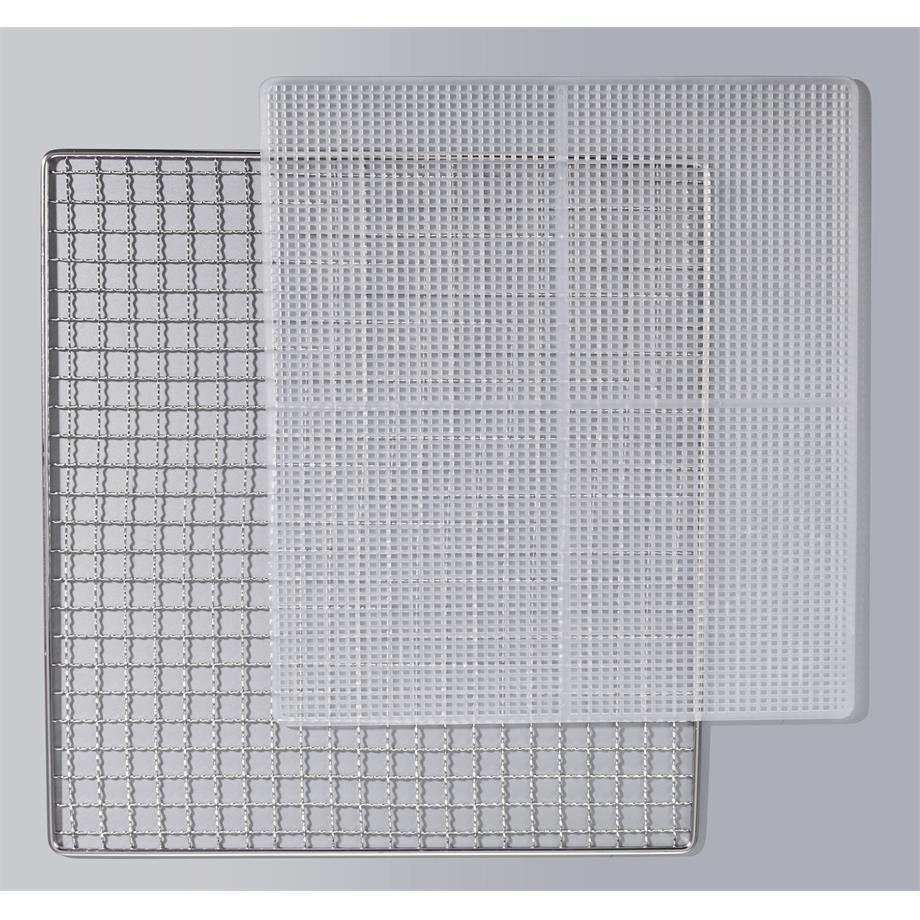 K sušičce navíc získáte nejen 6 základních sušících plat v nerezovém provedení, ale také 6 vložek s jemným síťováním. Využijete je pro sušení drobných surovin, jako jsou například houby či bylinky nebo dokonalé domácí musli.