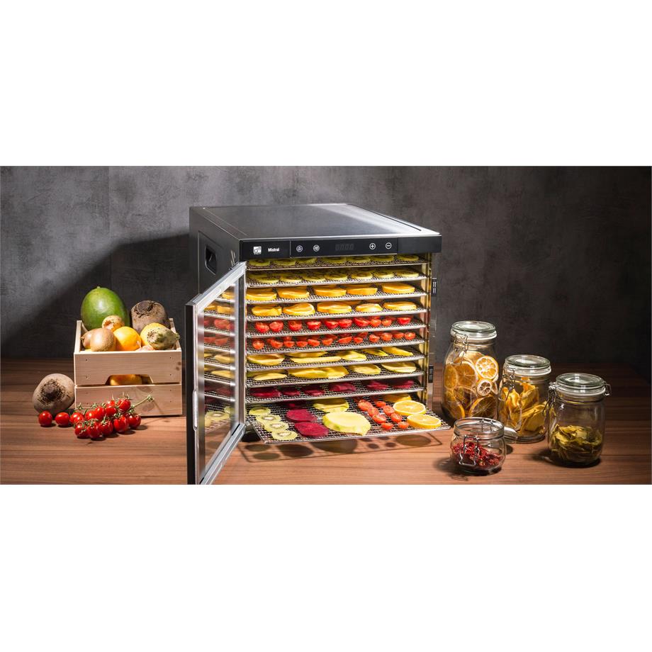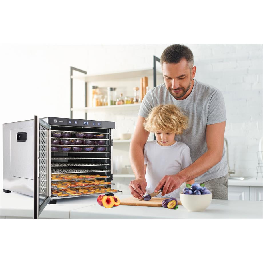 Horizontální nerezová sušička potravin s dvířky, časovačem, 10 sušícími platy a 10 jemnými síty suší ovoce, zeleninu i další suroviny naprosto rovnoměrně. Čím vás ještě nadchne?