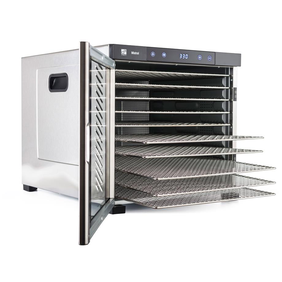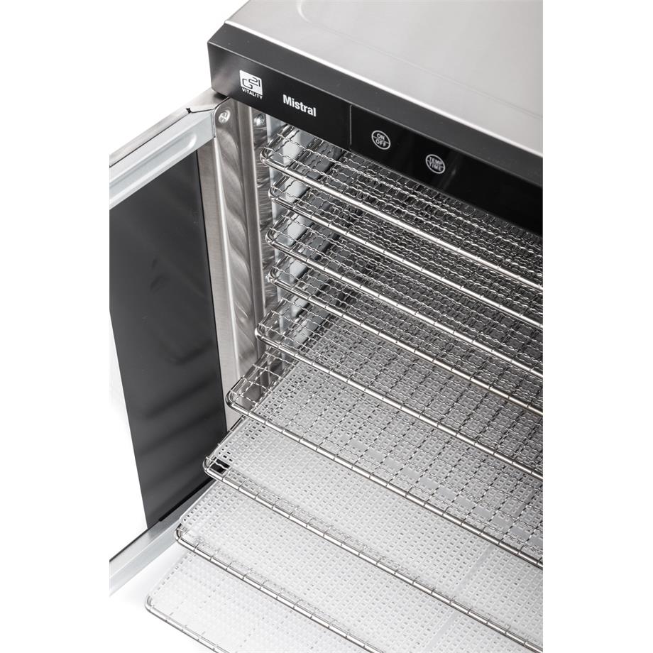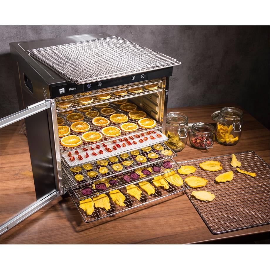Sušička potravin G21 Mistral má na rozdíl od běžných sušiček také nerezová dvířka, která zajišťují nižší spotřebu energie, dokonalou cirkulaci vzduchu, efektivnější sušení a zkracují dobu sušení potravin. Abyste dvířka v průběhu sušení nemuseli otevírat a do sušičky se tak nedostal chladný vzduch, vybavili jsme je okénkem. Snadno a rychle tak zjistíte stav sušeného ovoce, zeleniny, bylinek, hub nebo masa. Díky dvířkům můžete také vyjmout libovolný počet plat a sušit na menším počtu bez obav, že narušíte kvalitu sušení.