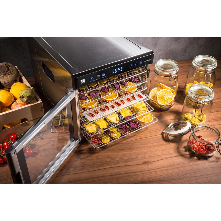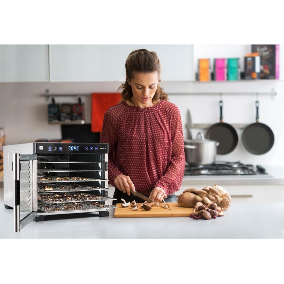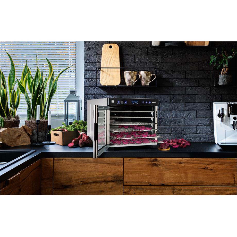 Horizontální sušička potravin G21 Breezer je menší sestrou sušičky G21 Mistral. Se svými 6 nerezovými sušícími tácy a 6 jemnými sušícími vložkami je díky kompaktnějšímu provedení ideální pro domácí použití nebo do provozů s menší pracovní plochou. Veškeré ovoce, zeleninu, bylinky, houby i maso usuší dokonale, rovnoměrně a jednoduše. Nemusíte přeskládávat plata ani otáčet suroviny. Dokonce se nemusíte zabývat ani údržbou sušičky, díky použitým materiálům je odolná a snadno se čistí.