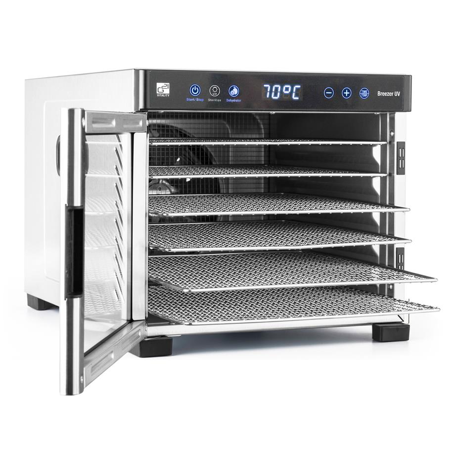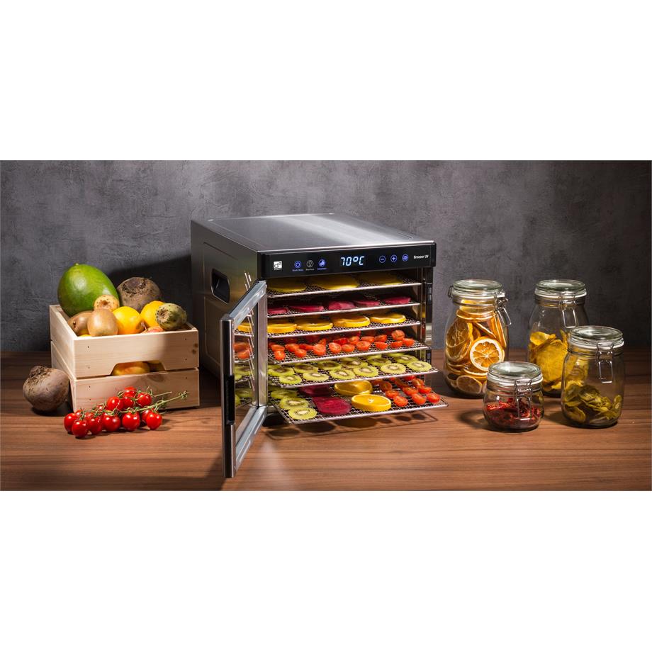 Horizontální nerezová sušička potravin s UV lampou, dvířky, časovačem, 6 sušícími platy a 6 jemnými síty suší ovoce, zeleninu i další suroviny naprosto rovnoměrně. Čím vás ještě nadchne?