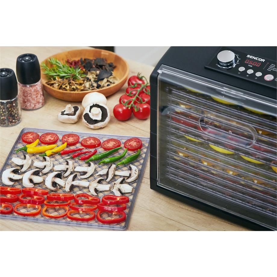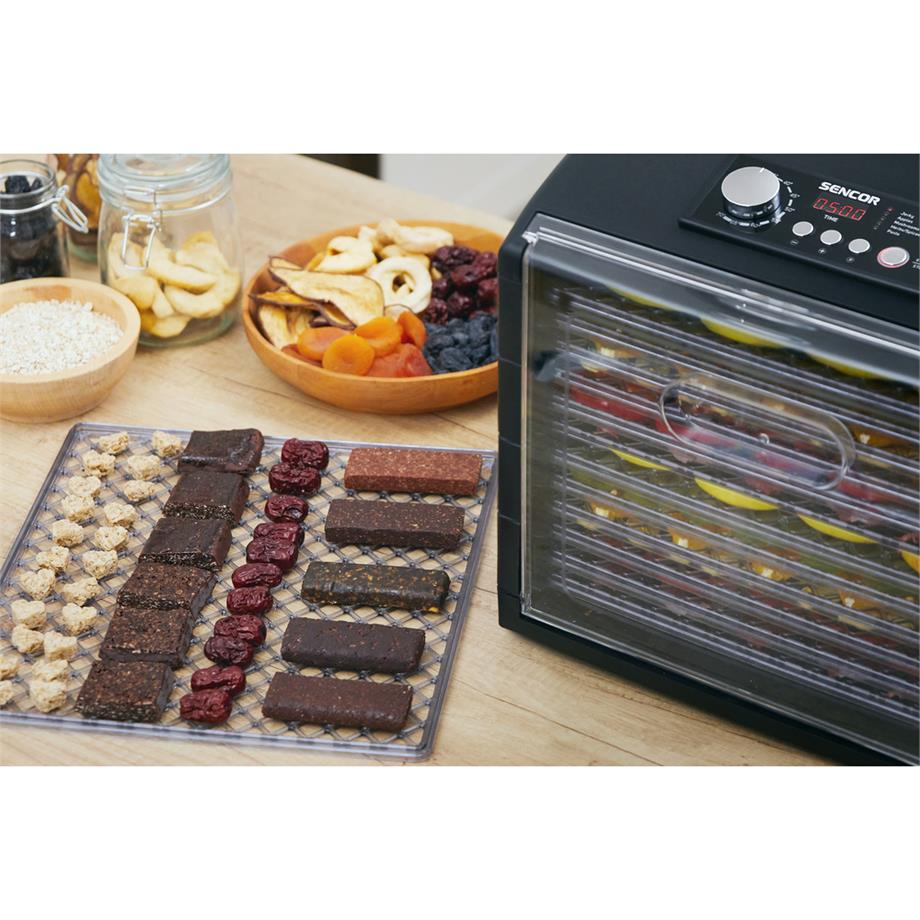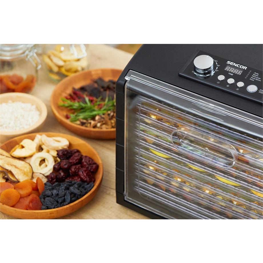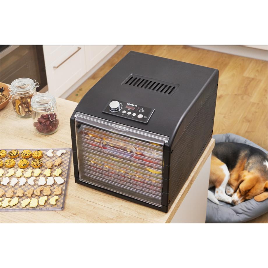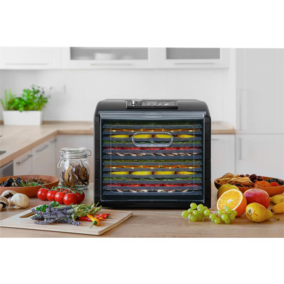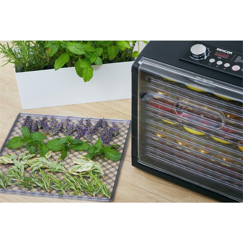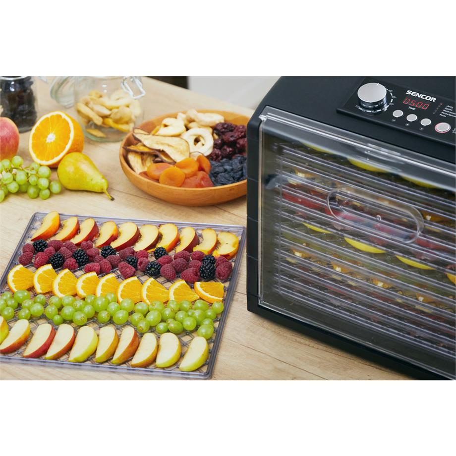 Průhledná dvířka a podnosy umožňují okamžitou vizuální kontrolu nad stavem sušení