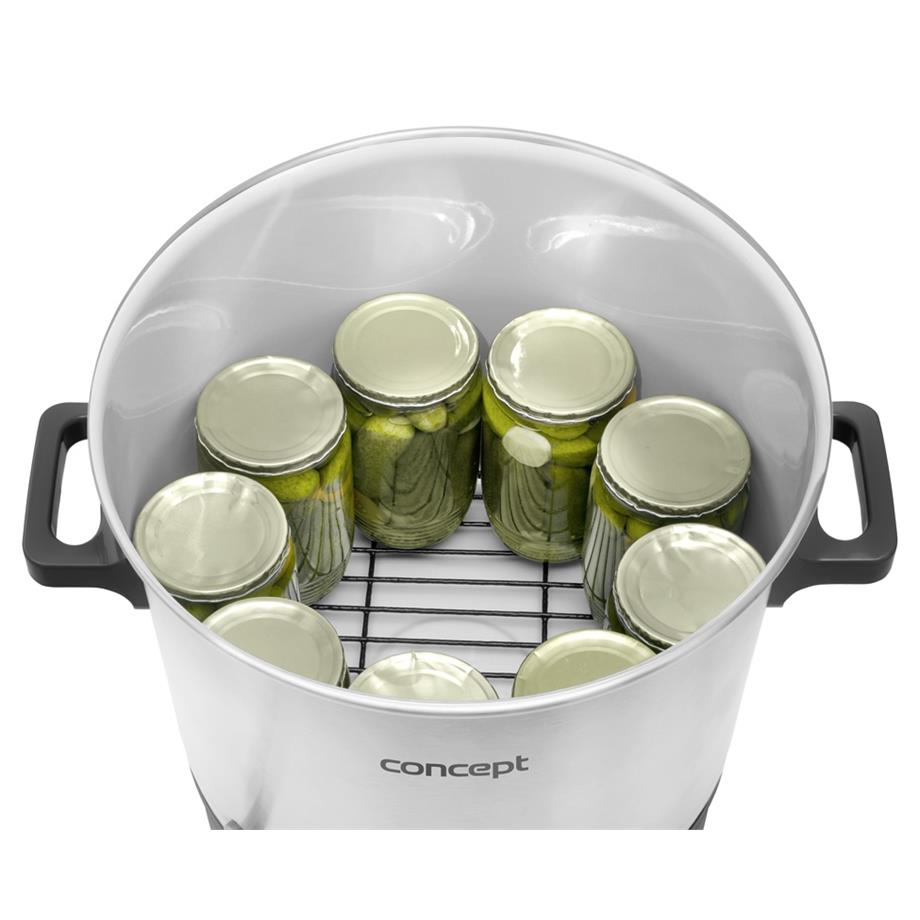 Se zavařovacím hrncem Concept ZH0030 uchováte vaši úrodu po celý rok. Poradí si nejen se zavařováním a sterilizací ovoce a zeleniny, ale i hub, masa, marmelád nebo džemů. Využít ho můžete také na výrobu šťáv, vaření a udržování teploty horkých nápojů, omáček, polévek, sterilizaci domácího moštu nebo k rozpouštění medu.Hrnec je vyroben z kvalitního nerezu a disponuje velkým vnitřním objemem 27 l. Je vybaven plastovou mřížkou, která se během zavařování vkládá na dno nádoby. Na jedno naplnění pojme až 11 ks sklenic o objemu 720 ml nebo 34 ks sklenic o objemu 370 ml.